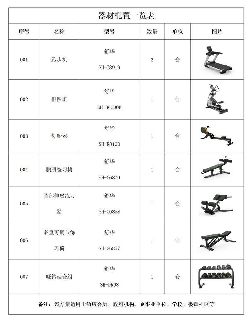 力量器械配置腹肌练习椅SH-G6879、多重可调节练习椅SH-G6857、背部伸展练习器SH-G6858、哑铃架套组SH-DR08,依据锻炼方式不同,能够满足日常多肌群训练,通过撸铁等力量训练,不但能够促进骨骼肌的发育,还有助于增强软组织和关节的牢固程度,撸铁训练会使大多数肌肉细胞加速新陈代谢,并且这个过程会比其他传统训练方式维持的时间长 ,能让人显得挺拔年轻。