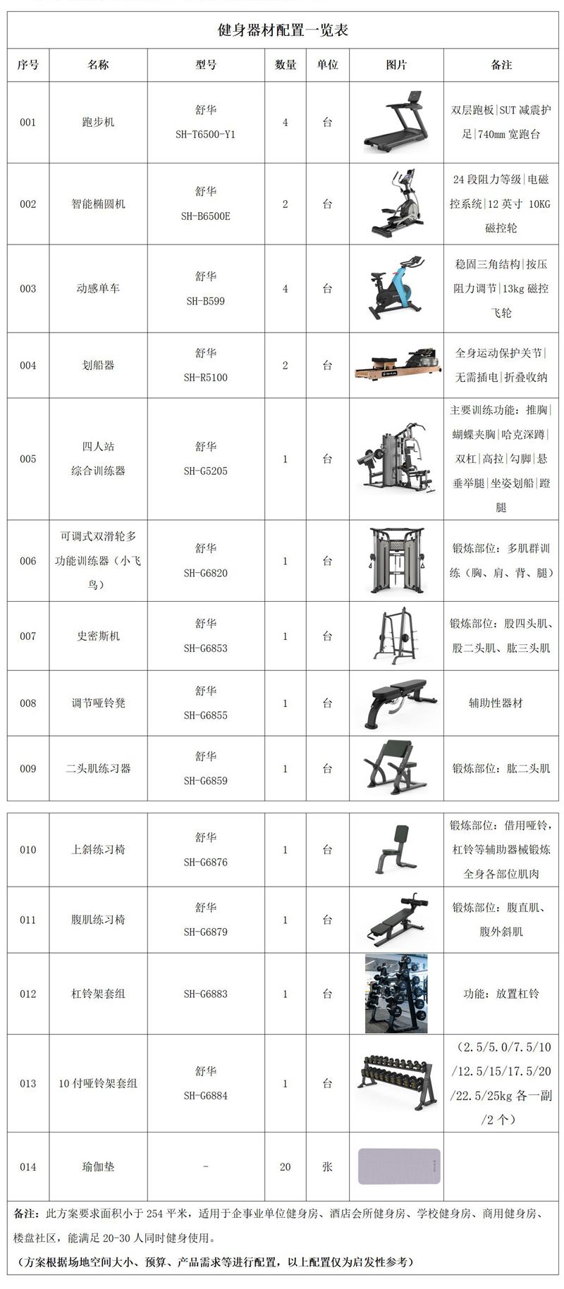此方案要求面积小于254平米,适用于企事业单位健身房、酒店会所健身房、学校健身房、商用健身房、楼盘社区,能满足30-50人同时健身使用。(方案根据场地空间大小、预算、产品需求等进行配置,以下配置仅为启发性参考)