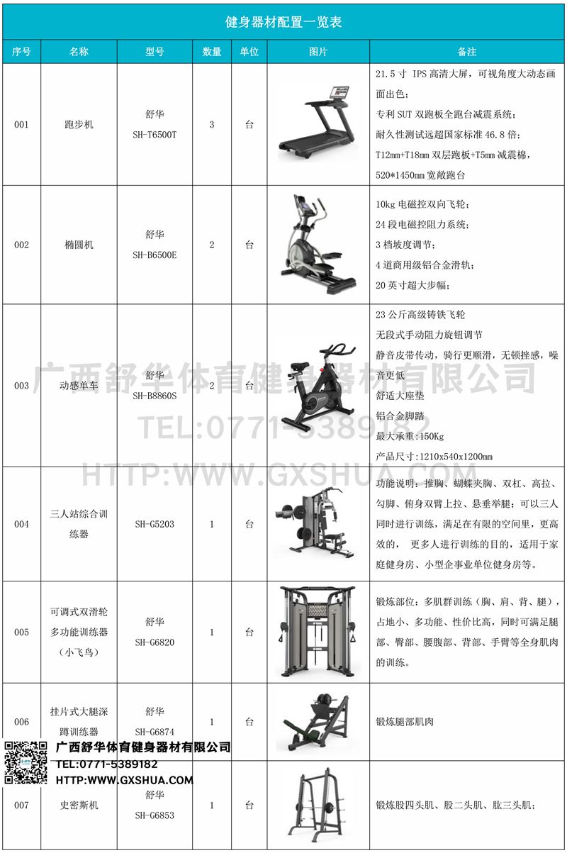 小飞鸟(1台)、挂片式大腿深蹲训练器1台)、史密斯机1台)多重可调节练习椅1台)、腹肌板(1台)、10付哑铃套组(1套)、哑铃凳(1台)、可以实现对不同肌肉群的针对性训练,满足肌肉训练需求,全方位激活身体机能。