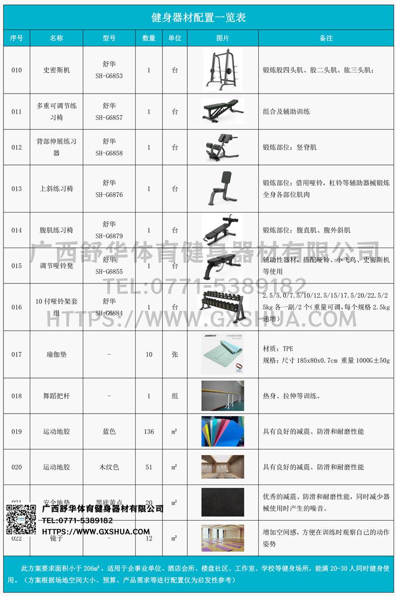 此方案要求面积小于206m²,适用于企事业单位、酒店会所、楼盘社区、工作室、学校等健身场所,能满20-30人同时健身使用。(方案根据场地空间大小、预算、产品需求等进行配置仅为启发性参考)