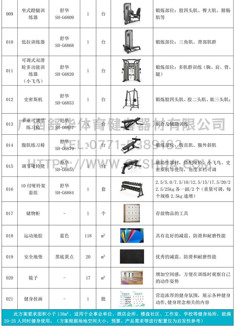 此方案要求面积小于138m²,适用于企事业单位、酒店会所、楼盘社区、工作室、学校等健身场所,能满20-25人同时健身使用。(方案根据场地空间大小、预算、产品需求等进行配置仅为启发性参考)